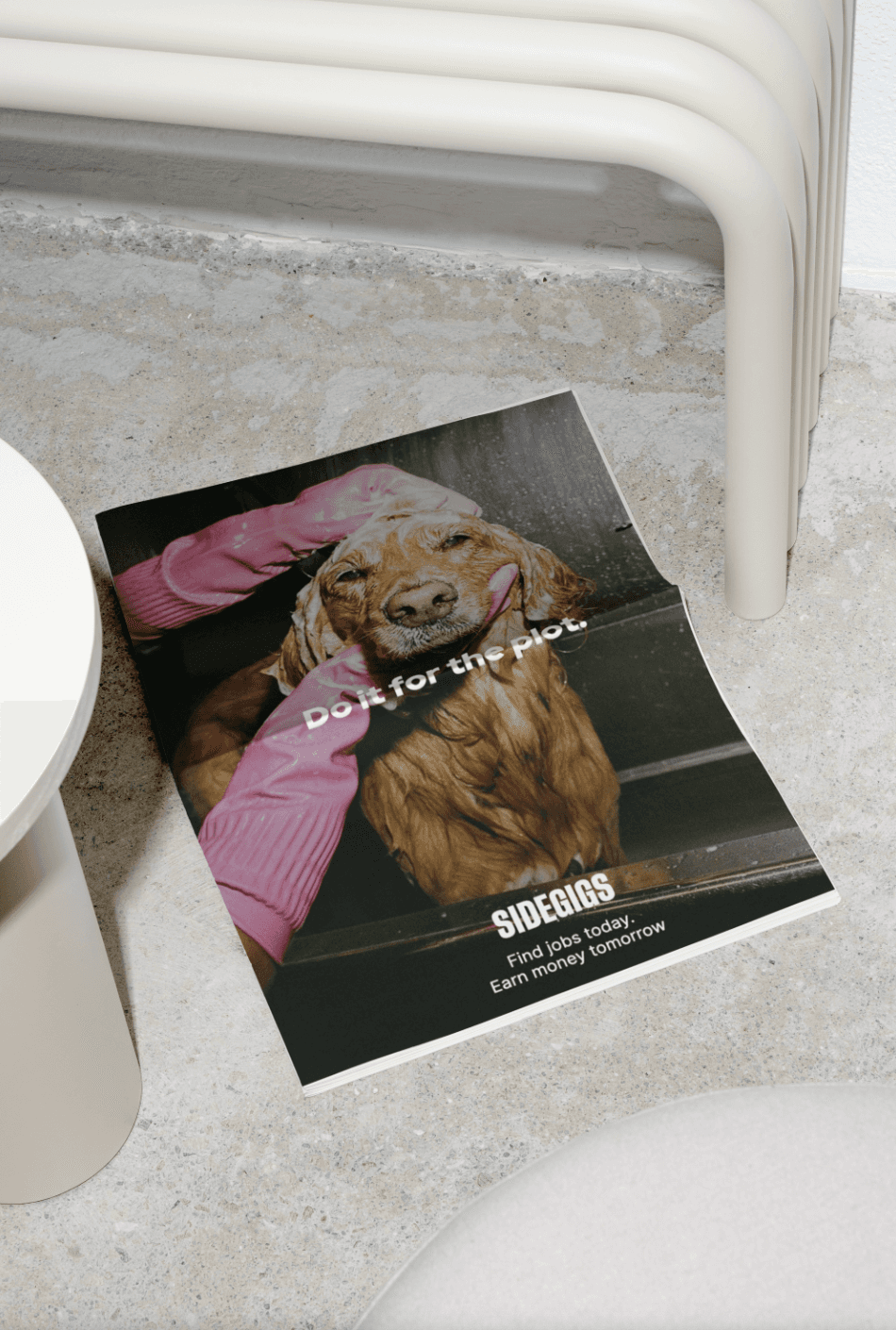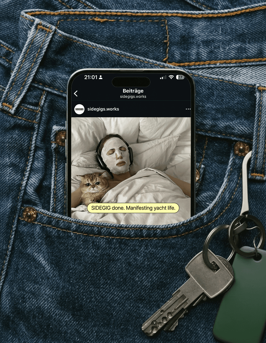 HUSTLE CULTURE RELOADED The platform turns into a stage for little side quests: one day at the bakery, another in the workshop, or somewhere completely different. The vibe is documentary-cool – real, raw, but with a certain lightness. Typography and logo slip flexibly into everyday moments, making it clear: this is about quick jobs that fit easily into your life. Do it for the plot.