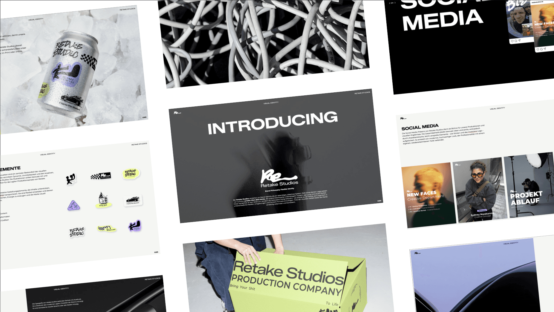 The identity for Retake Studios captures the energy of a production company that moves fast, thinks creatively, and isn’t afraid to get its hands dirty. Rooted in the worlds of sport and automotive culture, the branding balances precision and power with a lighter, almost playful twist that keeps everything feeling human and accessible. The visual language is built around flexibility: a logo system that shifts shapes, hand-drawn marks that feel instinctive, and graphic elements that behave more like stickers or track-side decals than traditional corporate assets. This creates a brand that can live on cars, cans, screens, or social feeds – always recognizable, never rigid. It’s a visual identity designed to move. To experiment. To hit record and go.